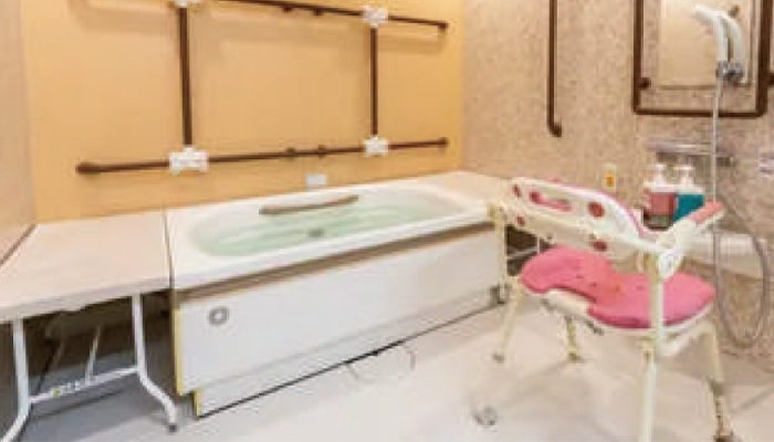 3つの広々とした個浴と横になったまま入浴できる機械浴室をご用意。脱衣所から洗い場まで段差のない設計で、シャワーキャリーにも対応。手すりも完備しているので、ご自身で入浴できる方でも安心してご利用いただけます。